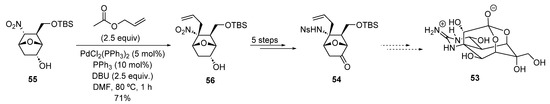 Shinada et al. [64] reported a stereoselective synthesis of the key intermediate 54 in the synthesis of Tetrodotoxin 53 (Scheme 17). The Pd-catalyzed Tsuji–Trost allylation [65] of compound 55 was key in the construction of the quaternary amino carbon center on the bicyclic derivative 55. This transformation employed PdCl2(PPh3)2 as catalysts and allyl acetate as an allyl source, rendering intermediate 56 in a 71% yield. The compound 56 was then transformed into oxanorbornene 54, which could be transformed into Tetrodotoxin 53 after several synthetic procedures.