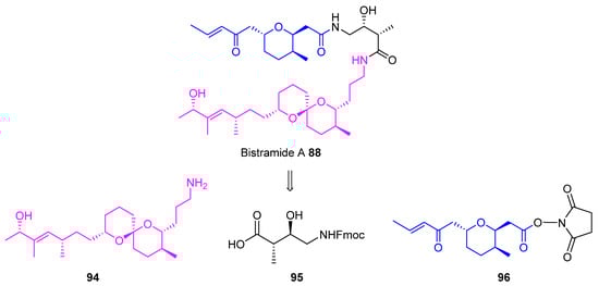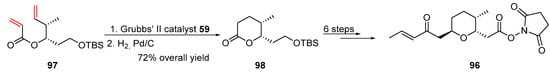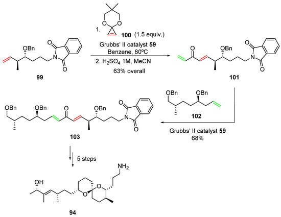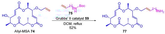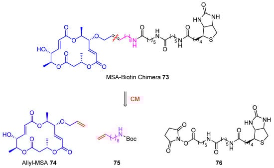 As shown in Scheme 20, the reaction between fragments 74 and 75 is a type 1 metathesis produced by the second-generation Grubbs’ catalyst 59, in dichloromethane as a solvent and under reflux to generate 77 in 52% yield. Subsequent deprotection of the amine and biotinylation with 76 produced the final MSA–biotin chimera 73 [73]. Ongoing research is focused on targeting fishing studies, using this chimera, to investigate a potent inhibitor of cell–cell adhesion [71].