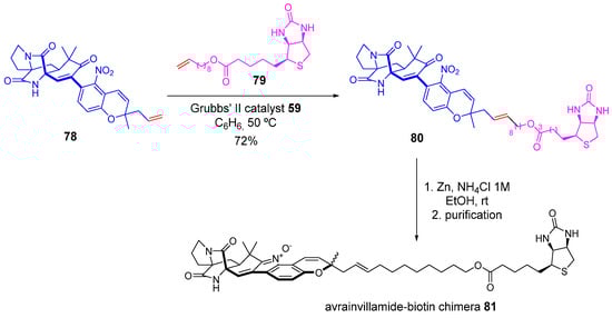 The type 1 olefin metathesis reaction reported in the synthesis of the avainvillamide–biotin chimera 81 is depicted in Scheme 21. A reaction between intermediate 78 and the terminal alkene of 79 catalyzed by 59 occurred in benzene at 50 °C giving rise to intermediate 80 in a 72% yield. A subsequent step was a reductive cyclization of 80, followed by HPLC purification, leading to the target molecule 81 [71].