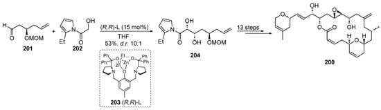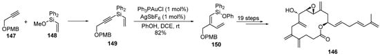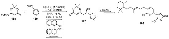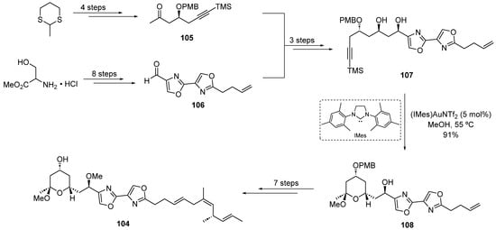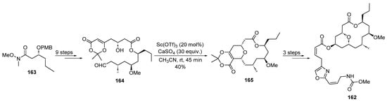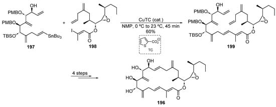 - Trost, B.M.; Amans, D.; Seganish, W.M.; Chung, C.K. Evaluating Transition-Metal-Catalyzed Transformations for the Synthesis of Laulimalide. J. Am. Chem. Soc. 2009, 131, 17087–17089. [Google Scholar] [CrossRef]