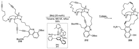 - Zhang, W.; Moore, J.S. Alkyne Metathesis: Catalysts and Synthetic Applications. Adv. Synth. Catal. 2007, 349, 93–120. [Google Scholar] [CrossRef]