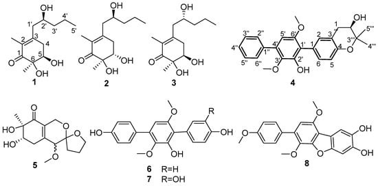 In summary, this study focused on the isolation and structural elucidation of four new compounds and four known compounds from the marine fungus Aspergillus sp. ITBBc1. The identification of these compounds was accomplished through the application of diverse spectroscopic techniques and comparison with published data. Compounds 1–3 have a similar structure to compounds reported by González Coloma et al., obtained from Stemphylium solani [], which have biocidal activity simultaneously against more than one category of harmful organisms affecting plants. Compound 4 belongs to p-terphenyl, possessing the same skeleton with prenylterphenyllin G [] and modified by hydroxy group at C-2‴. Compound 5 is an anazaphilone derivative that was first reported by Zhang et al. []. Compounds 6 and 7 are p-terphenyl derivatives and have the ability to inhibit wheat coleoptile growth significantly according to the previous reports []. Compound 7 has also been reported as an important anti-proliferative and pro-apoptotic agent for ovarian cancer []. Compound 8 is a terphenyllin derivative. Our results showed that compounds 6–8 exhibited remarkable antagonistic activities against the germination of Triticum aestivum L. and Oryza sativa L. seeds, but did not show effects against and Amaranthus retroflexus L. Therefore, it can be roughly concluded that compounds 6–8 are only phytotoxic against monocots. These bioactive compounds can be considered for weed control as herbicides in the field of dicotyledonous crops as they are only toxic to monocots, so they can be mixed with fertilizer to inhibit the germination of monocotyledonous weeds in the soil. Taken together, the unique structures of new compounds and the biologically active compound could provide an interesting foundation for further investigations.