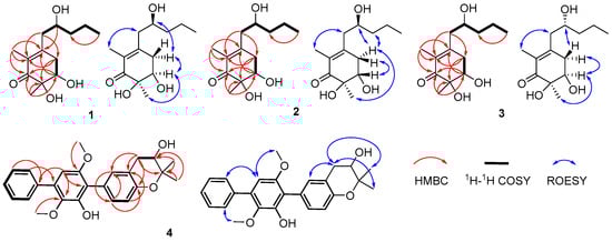 Key HMBC, 1H-1H COSY and ROESY correlations of new compounds 1–4.