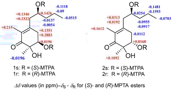 Megastigmanone B (2) was isolated as colorless oil. Its molecular formula, C13H22O4, was determined based on the HR-ESI-MS ion at m/z 265.1447 [M + Na]+ (calcd, C13H22NaO4, 265.1410), indicating three degrees of unsaturation. Comparison of its 1D and 2D NMR data with those for compound 1 revealed that compound 2 shared the same skeleton with compound 1, except for the different configurations of H-5, revealed by the ROESY correlation between CH3-6 and H-5 in 2. The absolute configuration of C-5 and C-2′ in compound 2 was also determined by the modified Mosher’s method and has been determined to be (5S, 6R)-5, 6-dihydroxy-3-((S)-2′-hydroxypentyl)-2, 6-dimethylcyclohex-2-en-1-one according to the ΔδRS value analysis of the 1H NMR data of (S) and (R)-MTPA esters of compound 2 (Figure 3; Figures S20–S23).