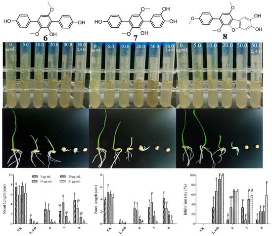 The phytotoxic activity of the isolated compounds was tested using Triticum aestivum L. (monocots), Oryza sativa L. (monocots) and Amaranthus retroflexus L. (dicotyledon) seeds. As a result, p-terphenyl derivatives of compounds 6–8 exhibited significant antagonistic activities against the germination of Triticum aestivum L. and Oryza sativa L. seeds as well as the root and shoot lengths of seedlings with a dose-dependent relationship (Figure 4 and Figure 5). Compound 7 exhibited almost identical phytotoxic activity, indicating that the hydroxyl group at position C-5 has no impact on their phytotoxicity. However, they have no significant effects against Amaranthus retroflexus L.