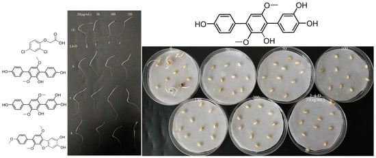 The Triticum aestivum L. (monocots), Oryza sativa L. (monocots) and Amaranthus retroflexus L. (dicotyledon) seeds were disinfected with 8% sodium hypochlorite solution for 15 min and then washed three times with sterilized water. Then, Triticum aestivum L. seeds were placed in a 15 mL tube containing 5 mL of 1/2 MS medium with four concentrations (0, 5, 10, 20, and 50 μg/mL). Oryza sativa L. and A. retroflexus seeds were evenly placed on sterilized filter paper in separate 120 mm Petri dishes containing 2 mL of compound 7 with four concentrations (0, 20, 50, 100, 150, and 200 μg/mL). Seeds cultivated at a 25 ℃ growth chamber for upright growth for 5 d (16 h/8 h light/dark cycle). Then, the shoot length and root length of each treatment were measured, and the germination inhibition rates were calculated. The commonly used synthetic herbicide 2, 4-dichlorophenoxyacetic acid (2, 4-D) was used as a positive control. The inhibition percentage was calculated using the formula as follows: