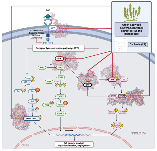 Lau, V.; Nurkolis, F.; Park, M.N.; Heriyanto, D.S.; Taslim, N.A.; Tallei, T.E.; Permatasari, H.K.; Tjandrawinata, R.R.; Moon, S.; Kim, B. Green Seaweed Caulerpa racemosa as a Novel Non-Small Cell Lung Cancer Inhibitor in Overcoming Tyrosine Kinase Inhibitor Resistance: An Analysis Employing Network Pharmacology, Molecular Docking, and In Vitro Research. Mar. Drugs 2024, 22, 272. https://doi.org/10.3390/md22060272