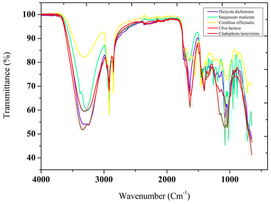FT-IR spectra of the five studied seaweeds that were collected from the northeastern coast of Algeria.