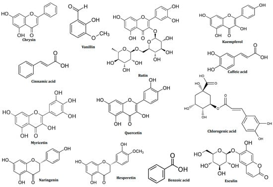 There are differences in the composition of the green seaweed, U. lactuca, which was the subject of this study. Hespertin, which makes up 3.93% of the methanolic fraction of C. laetevirens, is a polyphenol. The last 9% comprises naringenin, quercetin, rutin, cinnamic acid, caffeic acid, and 4-hydroxy-coumaric acid. This bioactive composition is quite similar to that obtained from C. glomerata, where rutin, quercetin, and kaempferol harvested in Thailand could be detected [57]. On the other hand, the methanolic fraction of U. lactuca corresponds better to that of the brown and red seaweed studied. Vanillin makes up 39.32% of its composition, making it a predominant polyphenol. The results of Kumar et al. for Ulva rigida [55] and esculin as a coumarin at 9.51% are equivalent to those of this study. The amounts of benzoic acid and hesperine in the ethyl acetate and n-butanol fractions of the two seaweeds are still comparable, ranging from benzoic acid (16–19%) to hespertin (3–4%). The results are consistent with those found in samples of U. fasciata collected in the Mediterranean [58] and C. glomerata collected in Poland [59]. The following figure (Figure 2) displays the chemical structures of the major bioactive compounds identified in the methanolic extracts of the brown algae D. dichotoma and S. muticum, the red algae C. officinalis, the green algae U. lactuca, and C. laetevirens. The overall data for the analysis are provided in the Supplementary Materials in Tables S1–S5 and Figures S1–S5. These findings suggest that, with a few minor exceptions, the composition of the studied seaweed is mainly comparable. This suggests that their growth environment, including their shared geographic location, environmental conditions, and interactions with other organisms, impacts them [60,61].