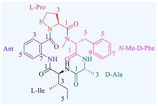 Naturally occurring cyclic peptides have garnered much attention as a drug discovery resource [11,12]. This is because cyclic peptides are composed of amino acid residues, including nonproteinogenic residues, which are arranged in a three-dimensional structure and have high affinity for their target biomolecules [12]. In addition, cyclic peptides are reported to be more stable and membrane-permeable than general linear peptides [13].