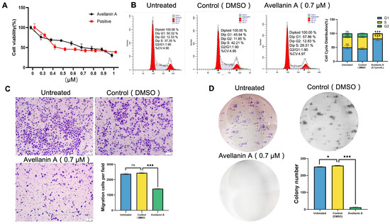 Antiproliferative efficacy of compound avellanin A on RWPE-1 cells: (A) RWPE-1 cells were treated with the indicated concentrations of compound avellanin A for 48 h, and the cell viability was determined by a CCK-8 assay. (B) The RWPE-1 cells were treated with indicated concentrations of compound avellanin A for 48 h, and the cell cycle distribution was assessed by flow cytometric analysis; ns, not significant, *** p < 0.001, compared to the control group. (C) Transwell assay evaluating the migration abilities of RWPE-1 cells treated with the indicated concentrations of compound avellanin A for 7 days. ns, not significant, *** p < 0.001, compared to the control group. (D) RWPE-1 cells were treated with the indicated concentrations of compound avellanin A for 7 days, after which colony formation was assessed; * p < 0.05 and *** p < 0.001, compared to the control group.