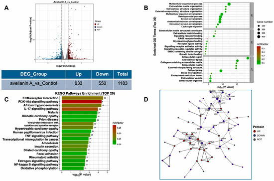 Transcriptome analysis of RWPE-1 cells treated with compound avellanin A vs. the control: (A) Volcanic map showing the differential gene expression distribution. The scattered dots in the figure represent individual genes, with grey dots indicating genes with no significant differences, red dots representing upregulated genes with significant differences, and blue dots representing downregulated genes with significant differences. Statistics of differentially expressed genes. A total of 1183 differentially expressed genes were identified, including 633 upregulated genes and 550 downregulated genes. (B) GO functional enrichment analysis of the DEGs. (C) KEGG pathway enrichment of differentially expressed genes. (D) PPI network construction for the identification of hub genes.