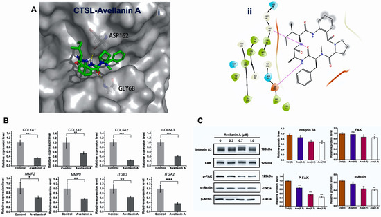 The binding mode of avellanin A to its targets, determined by molecular docking: (A) Binding mode of avellanin A to cathepsin L: (i) three-dimensional structures of the binding pockets were constructed with PyMOL 3.0 software; (ii) 2D interactions of compounds and their targets. (B) Relative mRNA expression of COL1A1, COL1A2, COL5A2, COL6A3, MMP2, MMP9, ITGA2, and ITGB3; * p < 0.05, ** p < 0.01, and *** p < 0.001, compared to the control group. (C) The expression of ITGB3, FAK/p-FAK, and α-Actin was analysed by Western blotting. The analysis utilized β-Actin as a reference for quantifying relative gene expression levels. * p < 0.05, ** p < 0.01, and *** p < 0.001, compared to the control group.