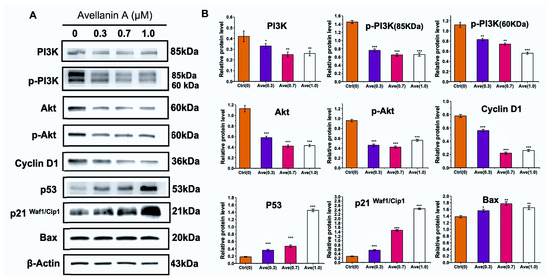 Effect of avellanin A on PI3K-Akt pathway-related protein expression in RWPE-1 cells. (A) The p-PI3K/PI3K, p-Akt/Akt, p53, Cyclin D1, P21Waf1/Cip1, and Bax proteins were analysed by Western blotting. The analysis utilized actin as a reference for quantifying relative protein expression levels. (B) Relative quantitative detection of protein expression compared with control. * p < 0.05, ** p < 0.01, and *** p < 0.001, compared to the control group.