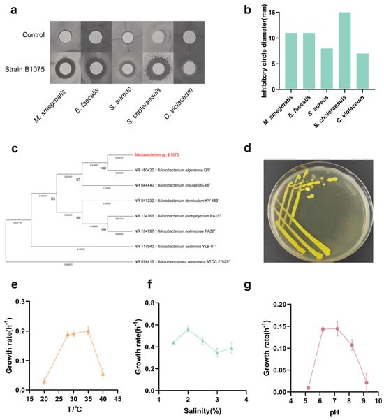 Identifying Microbacterium sp. B1075 as the target strain. (a) The antibacterial activity of strain B1075 was validated using the K-B paper disk method, with methanol solution added in the blank control group. (b) The inhibition zones were measured in two diameters, and the corresponding inhibition values were obtained by taking the average. (c) Neighbor-joining tree based on the 16S rRNA gene sequences of Microbacterium sp. B1075 and closely related taxa within the Microbacterium genus. (d) Macroscopic image displaying the colony morphology of Microbacterium sp. B1075. (e) Growth rates of strain B1075 at different temperatures (n = 3). (f) Growth rates of strain B1075 at different salinities (n = 3). (g) Growth rates of strain B1075 at different pH values (n = 3).