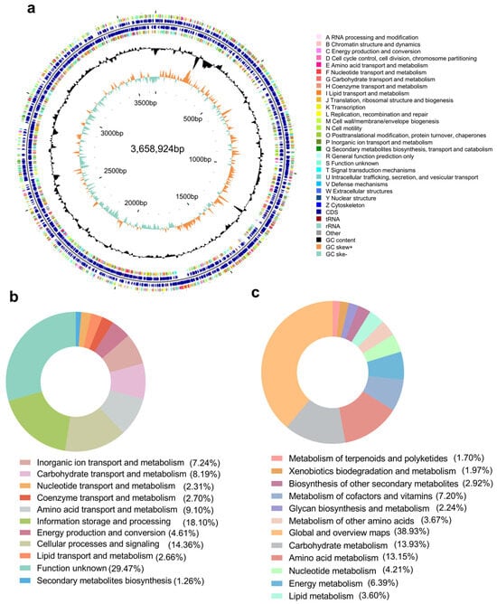 Genome annotation of strain B1075. (a) The circular map depicts the CDSs on the positive and negative strands, with different colors indicating different COG functional classifications. The first and fourth circles represent CDSs on the positive and negative strands, respectively, while the second and third circles represent tRNA and rRNA. The fifth circle represents the GC content, the sixth circle represents the GC-Skew value, and the innermost circle indicates the genome size (source: cloud.majorbio.com). (b) Pie chart showing the percentage of metabolism-related genes annotated using the COG database for strain B1075. (c) Pie chart illustrating the percentage of metabolism-related genes annotated using the KEGG database for strain B1075.