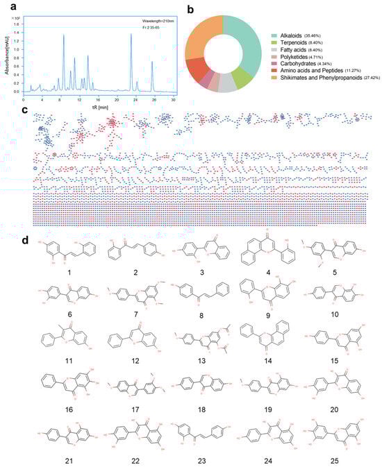 Annotation results of secondary metabolites produced by strain B1075 using GNPS. (a) HPLC chromatogram of Fr-2 fraction of secondary metabolites isolated from strain B1075 after separation by ODS column. (b) Number of known compounds annotated by GNPS for secondary metabolites Fr-2 produced by strain B1075. (c) Molecular network analysis of secondary metabolites Fr-2 produced by strain B1075 using LC-MS/MS technology in positive and negative ion modes. Red nodes represent annotated known compounds, while blue nodes represent unknown compounds. (d) Identification of 25 flavonoid compounds (Table S2) annotated by GNPS for Fr-2 fraction.