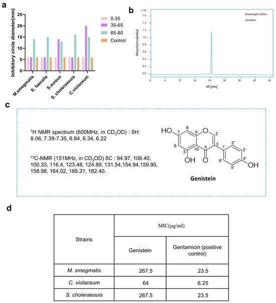 Isolation and identification of secondary metabolites and antibacterial activity of strain B1075. (a) Measurement of the diameter of inhibition zones of three fractions of secondary metabolites from strain B1075 separated by an ODS column. Fractions: 0–35 represents Fr-1; 35–65 represents Fr-2; 65–80 represents Fr-3; Control represents ‘control’ group (methanol). (b) Chromatogram of compound genistein obtained after the purification of secondary metabolite Fr-2 by HPLC. (c) Chemical shifts of carbon and hydrogen spectra along with the molecular structure of the isolated compounds. (d) Antibacterial activity values of compound genistein measured using the microdilution method.
