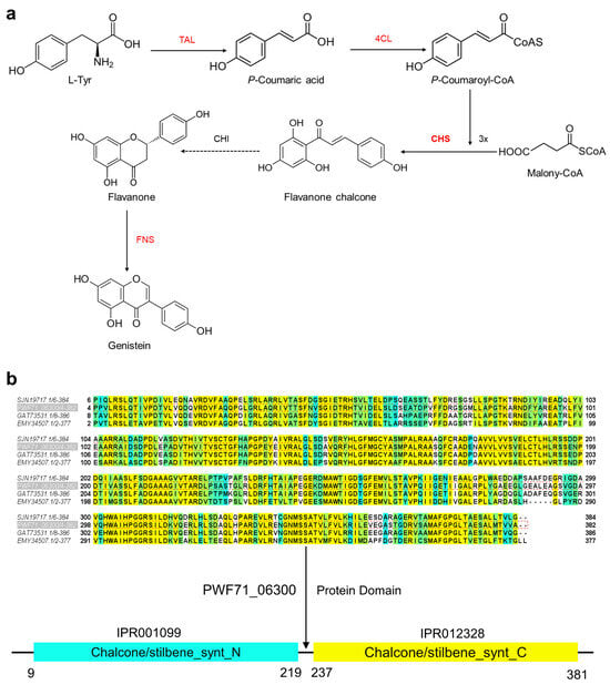 In the tyrosine pathway of genistein synthesis, tyrosine is initially catalyzed by tyrosine ammonia-lyase (VAL), yielding p-coumaric acid, which is further transformed to p-coumaroyl-CoA by 4-coumaroyl-CoA ligase (4CL). After that, chalcone synthase (CHS) is responsible for the synthesis of flavanone chalcone by adding 3X malonyl-CoA to p-coumaroyl-CoA. Flavanone chalcone is modified by chalcone isomerase (CHI) and converted to flavanone. Finally, genistein is synthesized by flavone synthase (FNS) [20]. Based on the synthesis pathways of flavonoids identified in bacteria [20], we conducted predictive analysis of the synthesis pathway by integrating the whole-genome sequencing results of Microbacterium sp. B1075. We conducted a local BLAST search on strain B1075 to identify putative homologous proteins involved in flavonoid biosynthesis. The comparison revealed a 72% protein sequence similarity of PWF71_01175 (WEF21307) to tyrosine ammonia-lyase (TAL, VEH25920) from Cellulomonas fimi NCTC7547, a 42% sequence similarity of PWF71_13600 (WEF20308) to 4-coumaroyl-CoA ligase (4CL, AHE41426) from Scutellaria lateriflora L, an 82% sequence similarity of PWF71_06300 (WEF22284) to chalcone synthase (CHS, GAT73531) from Microbacterium sp. HM58-2, a 29% sequence similarity of PWF71_14570 (WEF20497) to chalcone isomerase (CHI, WP_187272318) from Zeimonas arvi CC-CFT501, and a 32% sequence similarity of PWF71_09720 (WEF19579) to flavone synthase (FNS, QCP71067) from Pohlia nutans Lindb (Table S3). Based on the BLAST results, the predicted biosynthetic pathway of genistein is depicted in Figure 5a. In addition, structural domain prediction of the corresponding protein sequences in strain B1075 using InterPro [21] revealed complete synthesis capability for all predicted flavonoid synthesis enzymes, except for the chalcone isomerase (CHI) portion, where certain domains were missing (Figure S8). Chalcone synthase (encoded by the gene CHS, PWF71_06300, 1161 bp), predicted to contain both the N- and C-terminal domains of chalcone/stilbene synthase (Figure 5b), plays a pivotal role by condensing one molecule of 4-coumaroyl-CoA with three molecules of malonyl-CoA to produce the chalcone of genistein (Figure 5a). The generated chalcone serves as the carbon skeleton for the in vivo synthesis of flavonoids, providing a material basis for the synthesis of isoflavones, flavones, anthocyanin glycosides, flavanols, and other flavonoid substances [22].