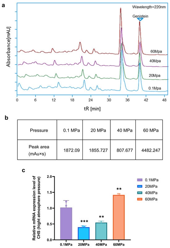 Impact of high hydrostatic pressure on the production of flavonoid compounds by strain B1075. (a) HPLC chromatograms of secondary metabolites extracted from strain B1075 under different hydrostatic pressure conditions. (b) Peak areas of genistein produced by strain B1075 at different pressures. The peak area at 60 MPa is approximately twice that at 0.1 MPa. Data represent the mean values of three independent experiments with similar results. (c) Relative mRNA expression level of the gene CHS under different pressure conditions. Error bars indicate the standard deviations from three independent experiments (*** p < 0.001, ** p < 0.01).