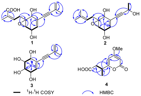Key HMBC and 1H-1H COSY correlations of compounds 1–4.