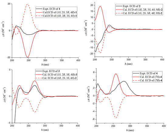 Calculated and experimental ECD spectra of 1–4.