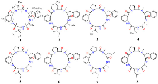 - Wang, X.H.; Lin, M.Y.; Xu, D.; Lai, D.W.; Zhou, L.G. Structural diversity and biological activities of fungal cyclic peptides, excluding cyclodipeptides. Molecules 2017, 22, 2069. [Google Scholar] [CrossRef] [PubMed]