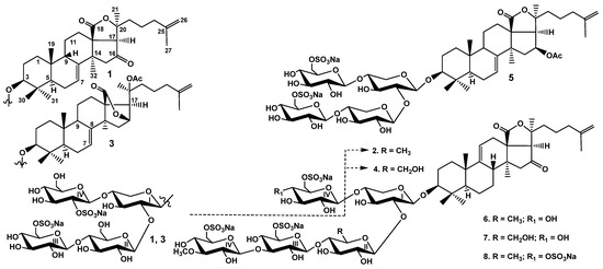 Chemical structures of glycosides isolated from Psolus peronii: 1—peronioside A; 2—psolusoside A; 3—psolusoside B; 4—psolusoside G; 5—psolusoside I; 6—psolusoside L; 7—psolusoside N; 8—psolusoside P.