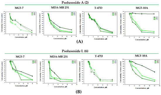 Cytotoxic effect of glycosides against breast cancer cells: (A) psolusoside A (2) against MCF-7, MDA-MB-231, T-47D, MCF-10A cells; (B) psolusoside L (6) against MCF-7, MDA-MB-231, T-47D, MCF-10A cells for 24 h, 48 h and 72 h. All experiments were carried out in triplicate. The data are presented as means ± SEM.