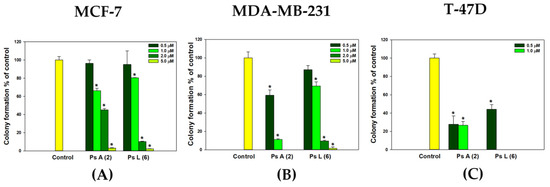 The number of MCF-7 (A), MDA-MB-231 (B) and T-47D (C) cell colonies under the treatment with different concentrations of psolusosides A (2) and L (6). Data are presented as means ± SEM. * p value ≤ 0.05 considered significant.
