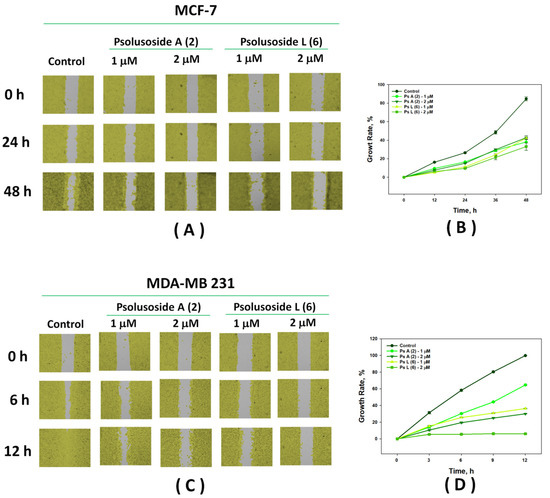 The scratch method is used to study the action of compounds with potential antitumor activity on cell motility and cell–cell interactions, which are connected to the ability of cancer cells to migrate. The search for substances capable of inhibiting their migration is relevant to the prevention of metastasis. Wound healing analysis involved comparison of the areas of migrating cells in the control and under treatment with the tested compounds at different time intervals. Psolusosides A (2) and L (6) were found to be effective in reducing the migration of the MDA-MB-231 and MCF-7 cells at non-cytotoxic concentrations (Figure 5). Thus, in the control, the MCF-7 cells migrated by 84.60 ± 2.12% within 48 h. Both glycosides, 2 and 6, reduced the migration of these cells to the scratch area by 33–42% at concentrations of 1 and 2 μM within 48 h (Figure 5A,B).