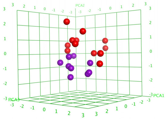 Three-dimensional plot of hemolytic activity (pIC50) dependence on the principal component values (PCA1—PCA3) calculated for 21 conformational forms of nine glycosides (1–8 and DS-psolusoside B). The glycosides demonstrating hemolytic activity with IC50 ≤ 10 µM were outlined as active and are marked in red, while the rest are marked in violet.