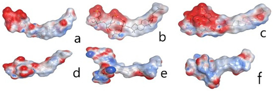 The charge distribution on the molecular surface of glycosides from sea cucumber P. peronii. Molecular surfaces are presented as a contour and colored according to the charge distribution (positive is blue, negative is red). Molecular structures are presented as sticks: (a)—psolusoside A (2); (b)—psolusoside G (4); (c)—psolusoside L (6); (d)—peronioside A (1); (e)—psolusoside B (3); (f)—psolusoside N (7).