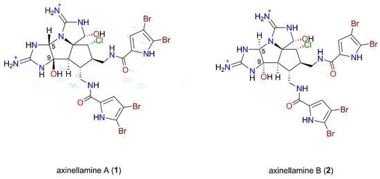 - Urban, S.; de Almeida Leone, P.; Carroll, A.R.; Fechner, G.A.; Smith, J.; Hooper, J.N.; Quinn, R.J. Axinellamines A-D, Novel Imidazo-Azolo-Imidazole Alkaloids from the Australian Marine Sponge Axinella sp. J. Org. Chem. 1999, 64, 731–735. [Google Scholar] [CrossRef]