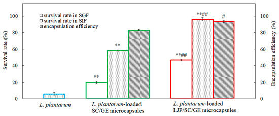 Figure 5. Encapsulation efficiency and survival rates of L. plantarum, L. plantarum-loaded SC/GE microcapsules, and L. plantarum-loaded LJP/SC/GE microcapsules in simulated gastrointestinal fluids (data are presented as means ± SD, n = 3; ** p < 0.01 versus free cells; # p < 0.05 and ## p < 0.01 versus SC/GE microcapsules).