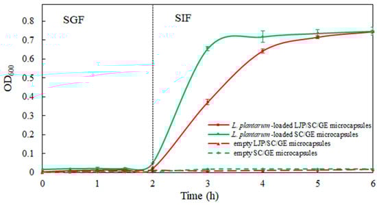 Empty microcapsules and L. plantarum-loaded microcapsules were incubated in SGF for 2 h and in SIF for 4 h to assess the release performance of the microcapsules. The in vitro release profiles are shown in Figure 7. As can be seen, the release media of empty LJP/SC/GE microcapsules and empty SC/GE microcapsules had a low absorbance over the incubation time in SGF and SIF, which could not affect the detection of L. plantarum release. During the incubation in SGF for 2 h, cell release from L. plantarum-loaded microcapsules was minor, with an OD600 of 0.050 for SC/GE microcapsules and an OD600 of 0.022 for LJP/SC/GE microcapsules, indicating that the microcapsules did not disintegrate in SGF. As a result, encapsulated L. plantanum cells were resistant to the gastric acid environment, and the LJP/SC/GE microcapsules were more stable in SGF than the SC/GE microcapsules. The strong electrostatic interaction between the LJP and the proteins was the major driving force for maintaining the structural integrity of the microcapsules, inhibiting pepsin and H+ access [18,35]. It was observed that the cell release rate from the microcapsules was accelerated when exposed to SIF. The L. plantarum-loaded SC/GE microcapsules began disintegrating in SIF, and the OD600 value increased to 0.656 within 1 h. In contrast, the LJP/SC/GE microcapsules showed a slow release of L. plantarum. The OD600 gradually increased to 0.372 within 1 h, followed by full cell release at approximately 3 h of incubation in SIF, with an OD600 of 0.715. The gelling properties of polysaccharides may be the main factor leading to slow release [10]. Adding LJP improved the structure and buffered the SIF’s diffusion process into the microcapsules. Therefore, LJP/SC/GE microcapsules offer better protection for probiotics, with more controlled and sustained release than SC/GE microcapsules. Similar results were obtained by Azam et al. [10]. The alginate beads presented burst release of L. brevis LBR1 in SIF, while adding carrageenan to the alginate beads showed slower release and better protection for L. brevis LBR1.