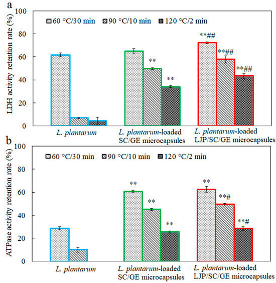 Figure 9 depicts the effects of temperature (60 °C, 90 °C, and 120 °C) on the LDH and Na+-K+-ATPase activity in free and microencapsulated L. plantarum. After heat treatments, the LDH and Na+-K+-ATPase activity in free cells was significantly lower (p < 0.01) than in untreated cells. Especially at 120 °C for 2 min, the Na+-K+-ATPase activity decreased from 8.7 U/g to 0 U/g, with a retention rate of 0%. It can be seen that the heat treatment significantly damages the LDH and Na+-K+-ATPase activity, which severely affects the viability of the probiotics. Zhen et al. also reported that heat treatments affected the LDH and Na+-K+-ATPase activity significantly more than hexokinase, pyruvate kinase, phosphofructokinase, and Ca2+-ATPase [39]. The microencapsulated cells maintained higher LDH and Na+-K+-ATPase activity than the free cells, and a significant increase in the retention rate of enzyme activity was observed with the addition of LJP. This result was consistent with the changes in the cell survival of free and microencapsulated L. plantarum under the same heat treatments (Figure 8). These data suggest that LJP might act as a thermoprotectant, reducing cell damage when heated. Studies demonstrated that the thermoprotective action of some saccharides was to maintain the unique liquid crystalline configuration of the membrane lipid bilayer by replacing hydrogen-bonded water in the membrane bilayer during the drying process [43]. Xylooligosaccharide and soy polysaccharide could protect cellular LDH activity, possibly due to the hydrogen bonds between proteins and sugars [7]. LJP may protect the membrane via a similar mechanism. The polysaccharide–protein matrix might also enhance the interfacial properties and effective microencapsulation of probiotic bacteria [37]. Thus, the LJP/SC/GE carrier matrix acts as a physical shield for the probiotics and may alleviate the thermal and osmotic stresses on the bacteria during heating.