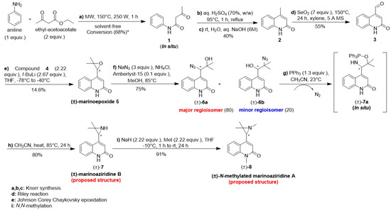 One of the key steps in the total synthesis of (±)-marinoaziridine B is the Staudinger reaction, which involves the (±)-marinoepoxide 5. Intermediate (±)-5 can be prepared by a convergent strategy of combining quinolin-2(1H)-on and isopropyl fragments via a Johnson Corey Chaykovsky epoxidation following the synthetic protocol described in our recently published article [22].