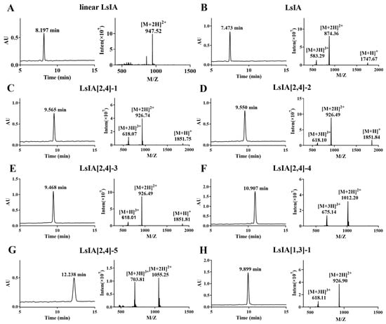HPLC and ESI-MS profiles of linear LsIA (A), LsIA (B), and its analogs (C–H). The chromatographic conditions were 10% to 55% buffer B in buffer A with a flow rate of 1 mL/min at UV-214 nm over 20 min, and the column temperature was 40 °C. A = 0.1% trifluoroacetic acid in H2O and B = 0.1% trifluoroacetic acid in acetonitrile. AU, absorbance units.