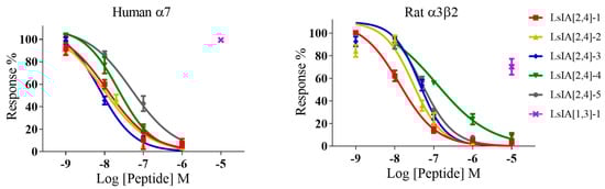 Herein, the nAChR inhibitory activities of the LsIA[1,3] and [2,4] modification analogs were evaluated by a two-electrode voltage clamp method at room temperature. The concentration–response curves of these analogs on the α7 and α3β2 nAChRs are shown in Figure 2.