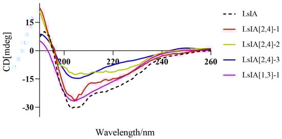 CD spectroscopy was used to study the conformational changes between the LsIA and its analogs LsIA[2,4]-1, LsIA[2,4]-2, LsIA[2,4]-3, and LsIA[1,3]-1. As shown in Figure 3, the positive Cotton effect around 190 nm and negative Cotton effect around 200 nm to 220 nm of the LsIA and its analogs indicated the presence of an α-helix and a β-sheet secondary structure. The CD spectra of LsIA[2,4]-1 and LsIA[2,4]-2 were similar to the LsIA, which showed a W-shaped pattern with negative ellipticities at 206 and 220 nm. The similarity of the CD spectra indicated the conserved three-dimensional structures, which are consistent with the maintenance of the nAChR blocking activities of LsIA[2,4]-1-2 (Table 1). Meanwhile, the CD spectra of LsIA[2,4]-3 showed weak negative ellipticities at 220 nm, and the activity and selectivity for α7 and α3β2 were changed. However, LsIA[1,3]-1 showed obviously different spectra from the LsIA with only one negative band at 206 nm, which reflected the different three-dimensional structures between them. The variation of the three-dimensional structure may be the reason for the loss of the nAChR blocking activity of LsIA[1,3]-1. The secondary structure contents of the LsIA and its analogs are shown in the supporting information (Supplementary Materials—Table S3).