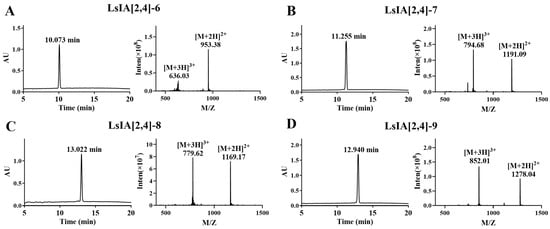 HPLC and ESI-MS profiles of LsIA[2,4]-6 (A), LsIA[2,4]-7 (B), LsIA[2,4]-8 (C), and LsIA[2,4]-9 (D). The chromatographic conditions were 10% to 55% buffer B in buffer A with a flow rate of 1 mL/min at UV-214 nm over 20 min, and the column temperature was 40 °C. A = 0.1% trifluoroacetic acid in H2O and B = 0.1% trifluoroacetic acid in acetonitrile. AU, absorbance units.