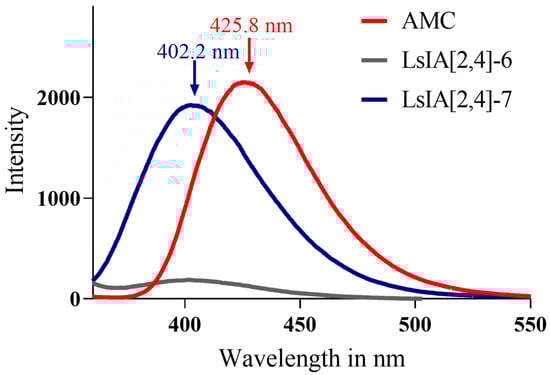 The fluorescent molecule AMC, with an emission wavelength of 390–480 nm at the UV-excitable blue fluorescence, is suitable for fluorescence measurements of biological samples [31]. The fluorescence excitation and emission spectra of LsIA[2,4]-6, LsIA[2,4]-7, and AMC were evaluated (Figure 5). A noticeable change in fluorescence intensity was observed for LsIA[2,4]-7 compared with LsIA[2,4]-6. The LsIA[2,4]-7 conjugated with AMC showed almost the same fluorescence emission intensity as AMC. However, the LsIA[2,4]-6 without AMC showed no fluorescence emission. These results proved the successful connection between the LsIA and AMC without fluorescence quenching. But the maximum emission wavelength of AMC has a little blueshift from 425.8 nm to 402.2 nm after conjugating with the LsIA.