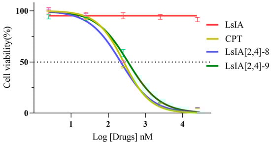 CCK8 experiment to evaluate the cytotoxicity of LsIA, CPT, LsIA[2,4]-8, and LsIA[2,4]-9 at 2.5 nM, 25 nM, 250 nM, 2.5 μM, and 25 μM. Each data point represents mean ± SEM (n = 5).