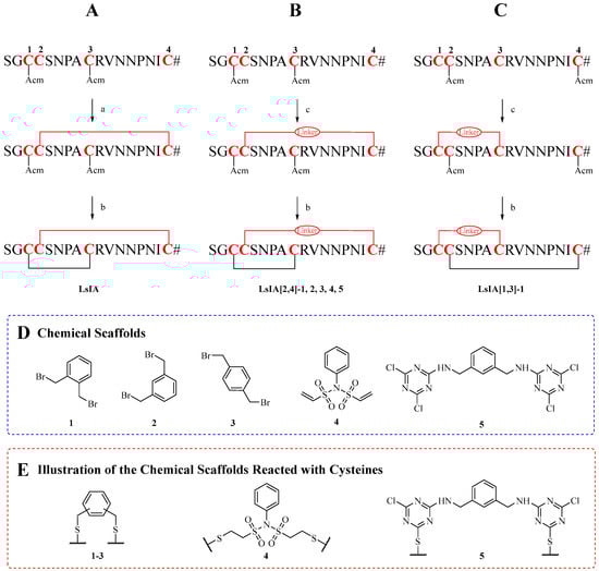 Synthetic routes of α-Conotoxin LsIA, LsIA[2,4]-1, 2, 3, 4, 5, and LsIA[1,3]-1 (# signifies C-term amidation). (A) Oxidative folding process of LsIA. (B) Cysteine[2,4] linker stapling of LsIA. (C) Cysteine[1,3] linker stapling of LsIA. (D) Structures of the linkers. Reagents and conditions: (a) K3[Fe(CN)6], Tris-HCl, MeCN, ultrapure water, rt, and 45 min; (b) I2, TFA, MeCN, ultrapure water, rt, 10 min, and vitamin C; (c) Chemical scaffolds 1–5, NH4HCO3 buffer, MeCN, rt, and 65 min. (E) Illustration of the chemical scaffolds 1, 2, 3, 4, and 5 after reaction with the sulfhydryl groups of cysteines.