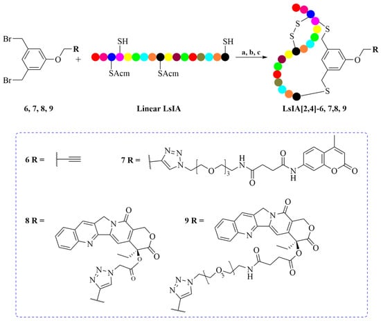 Synthetic route of LsIA[2,4]-6, 7, 8, and 9. Reagents and conditions: (a) CuSO4·5H2O, sodium ascorbate, MeCN-H2O, rt, and overnight; (b) NH4HCO3 buffer, MeCN, rt, and 65 min; (c) I2, TFA, MeCN, H2O, rt, and 10 min.