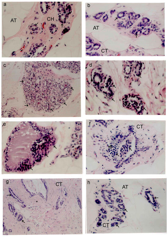 Standard mammary gland structure in histological sections (×200) of rat mammary tissues from the nontreated control (a) and treated SP (b) groups. Small mammary ducts are in the glands, partly surrounded by fibrous connective tissue (CT) and adipose tissues (ATs). Sections from the DMBA group (c–f) exhibit diverse histological alterations. (c) Dysplastic mammary gland (×200): the arrow indicates additional ducts and uneven cell division. Focal patches of dysplastic cells may be detected in these moderately dilated breast ductal tubules. (d) Fibroadenoma (×400): the arrow indicates a localized region of considerable ductal and epithelial hyperplasia, which inducts fibrosis (*). Invasive ductal carcinoma displays the proliferation of intraductal neoplastic epithelial cells with remarkable variations in cellular and nuclear sizes and shapes, which invaded the neighbor stroma, as seen in (e) (×400). The arrow represents a small lobular proliferation and localized epithelial hyperplasia with hyperchromatic enlarged nuclei. (f) (×400) The intraductal papillary carcinoma in situ: the arrow represents the micropapillae of neoplastic cells. (g,h) DMBA + SP group fibroadenoma (g) (×200) and stage of mammary gland cell death (h) (×400). (*) Fibrosis and CT connective tissues. H&E staining was used on all sections.