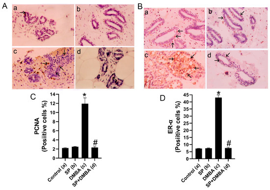 Figure displays immunohistochemical staining for PCNA and ER-α in breast sections, labeled as (A,B). Rats labeled as A and B were subjected to several treatments: (a) vehicle (as a control), SP (b), DMBA (c), and DMBA + SP (d) exhibiting PCNA- and ER-α-positive cell expressions in breast tissues. Photomicrographs and quantitative analysis (C,D) demonstrate the quantity of PCNA- and ER-α-positive cells The quantification of PCNA and ER-cells in each slice was conducted by enumerating the number of cells exhibiting brown staining positivity out of a total of 1000 cells seen at a magnification of 400×. Arrows indicate the presence of PCNA and ER-α-positive cells (H counter stained, 400×). Values expressed as mean ± SEM for six animals in each group. Significance was determined by one-way analysis of variance followed by a post hoc Dunnett’s test. * p < 0.05 vs. control group; # p < 0.05 vs. DMBA group.