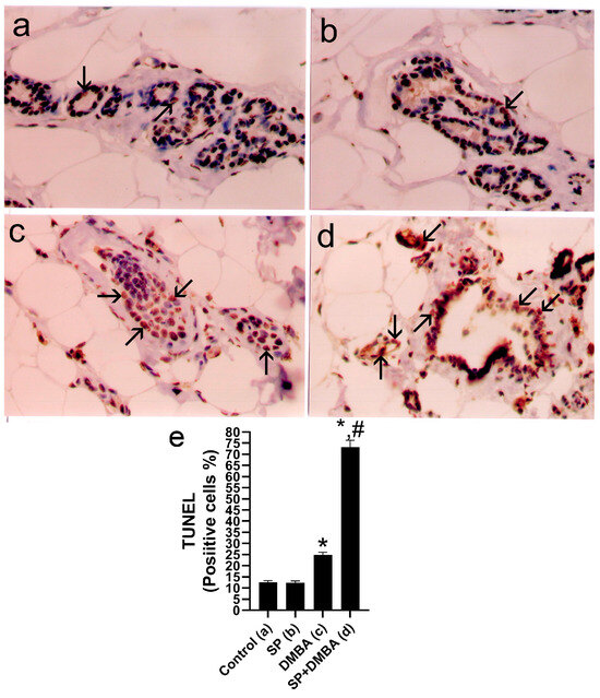 Figure displays the presence of TUNEL-positive cells in the mammary tissues of rats subjected to several treatments: (a) vehicle (as a control), SP (b), DMBA (c), and DMBA + SP (d). The semi-quantitative analysis (e) and the photomicrographs reveal the percentage of TUNEL-positive cells in various experimental groups. The percentage of TUNEL-positive cells in each slice was determined by quantifying the number of cells exhibiting brown staining using a 400× magnification, out of a total of 1000 cells. Arrows show TUNEL-positive cells (400×, H counterstained). Values expressed as mean ± SEM for six animals in each group. Significance was determined by one-way analysis of variance followed by a post hoc Dunnett’s test. * p < 0.05 vs. control group; # p < 0.05 vs. DMBA group.