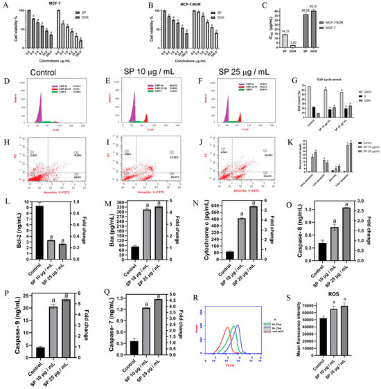 (A–C) Breast cancer cell growth decreased by SP. (A–C) illustrates how SP and DOX significantly reduce the viability of breast cancer cells. MCF-7 and MCF-7/ADR cells were treated with varying concentrations of SP and DOX, and 24 h later, their viability was evaluated. (D–G) demonstrate that SP produced cell cycle arrest using flow cytometry, a method by which the amount of cellular DNA was assessed following PI staining. (H–J) percentage of cells in the S, G1, G2, and M stages. In every instance, untreated cells in their growth media were used as controls. SP-treatment histograms for MCF-7 cells at zero (D), 10 µg/mL (E), and 25 µg/mL (F). (G) Three studies were used to calculate the average proportion of cells in each cell cycle phase. Cell apoptosis was observed using flow cytometry and an Annexin V/PI apoptosis detection kit (H–J). The dual parametric dot plots that incorporated PI fluorescence and Annexin V-FITC analysis reveal that early apoptotic cells are located in the bottom-right quadrant (Q4), late apoptotic cells in the top-right quadrant (Q2), and the viable cell population in the bottom-left quadrant (Q3). (K) demonstrates the percentage of cell necrosis and apoptosis. The reason for MCF-7 cell death is SP, which requires mitochondria. (L–Q) The expression of extrinsic and intrinsic apoptosis-related proteins (Bax, Bcl-2, cytochrome c, caspase 8, caspase 9, and caspase 7) was measured using microplate readers and ELISA kits following MCF-7 cells treated with suitable amounts of SP for 24 h. (R) The amount of ROS was measured using flow cytometry. The mean fluorescence density of the ROS level was calibrated using (S). All the data (n = 3) are displayed as mean ± SEM. One-way ANOVA was utilized first, and then Tukey’s post hoc analysis was carried out. a p < 0.05 was obtained when compared to control cells.